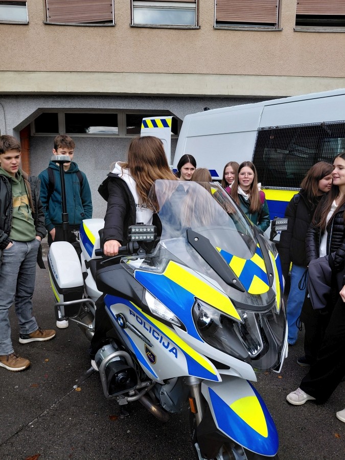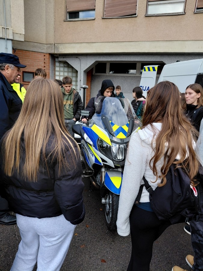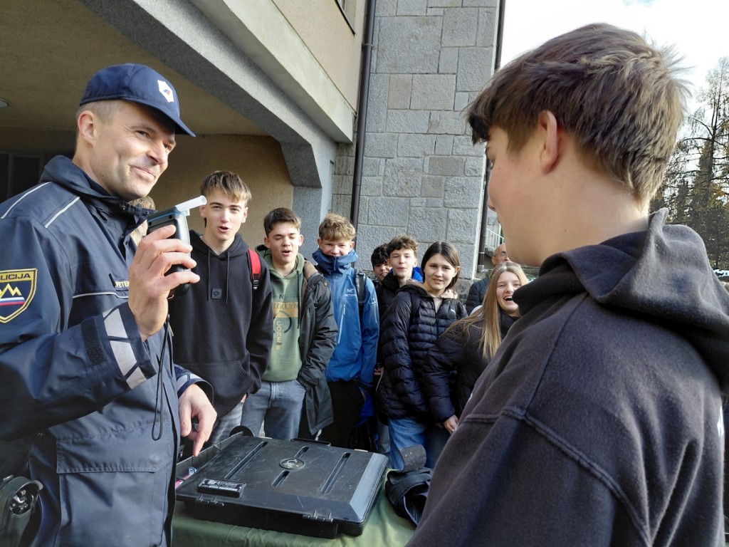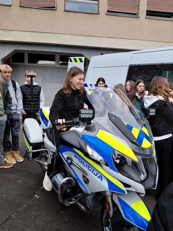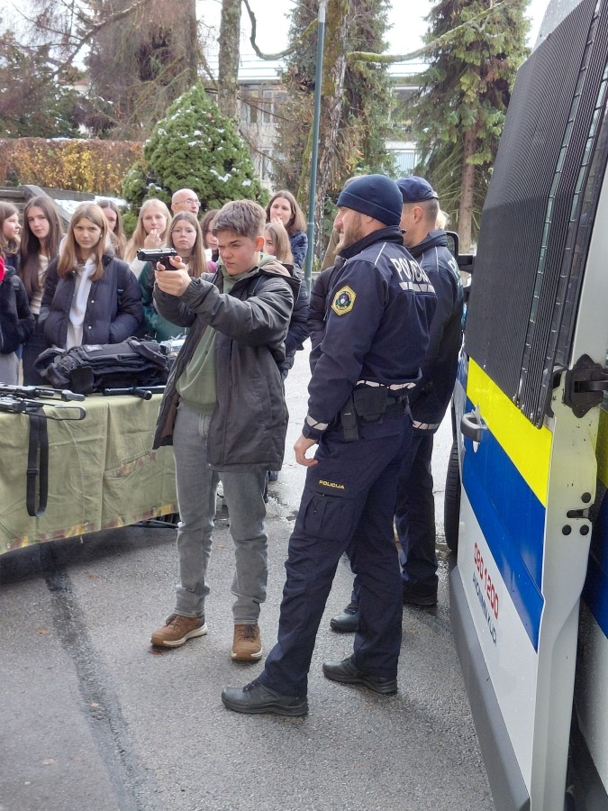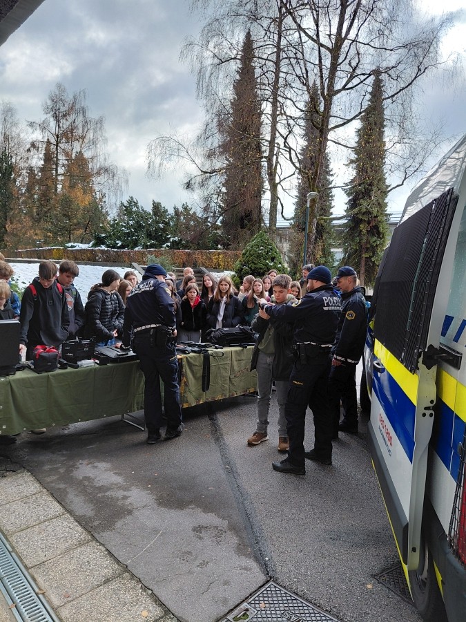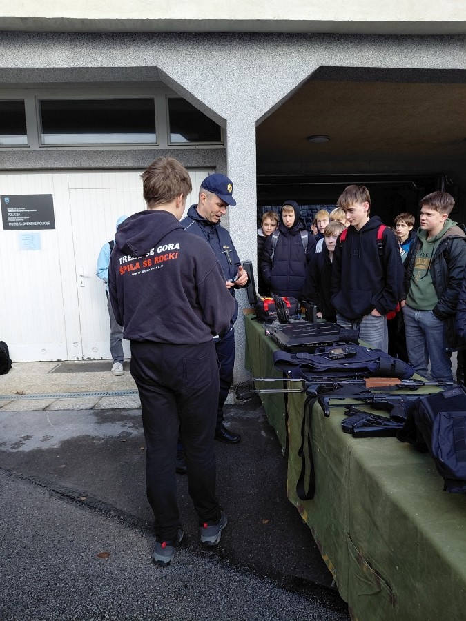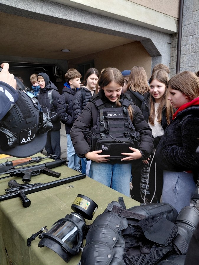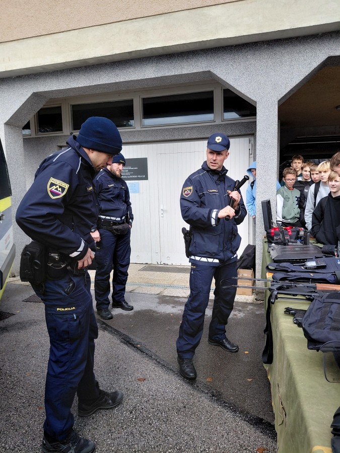 Pot nas je nato vodila vTacen, kljer smo se okrepčali z malico. Policisti pa smo učenkam in učencem predstavili poklic policista in opremo s katero pri svojem delu razpolaga policija.