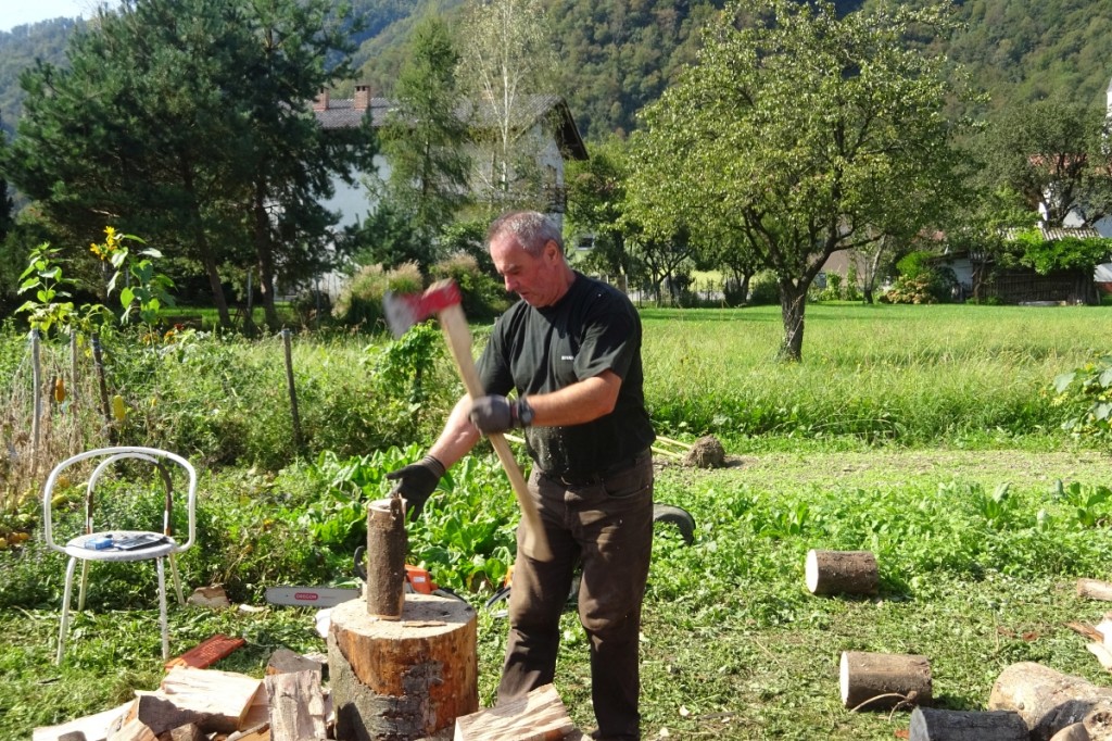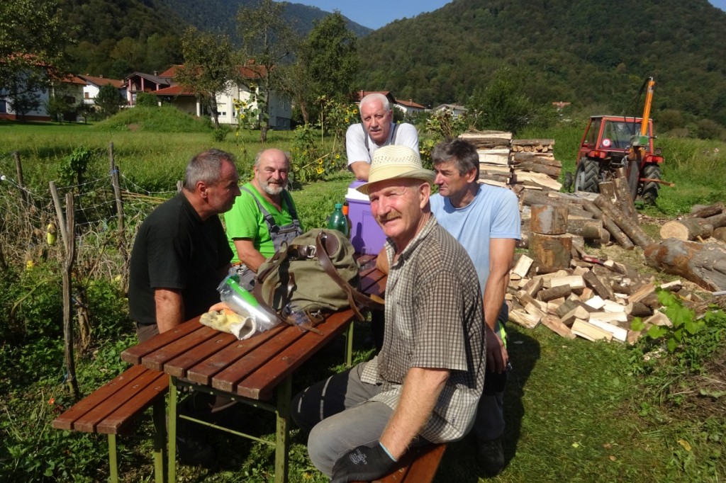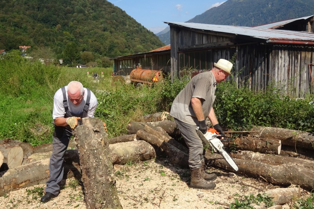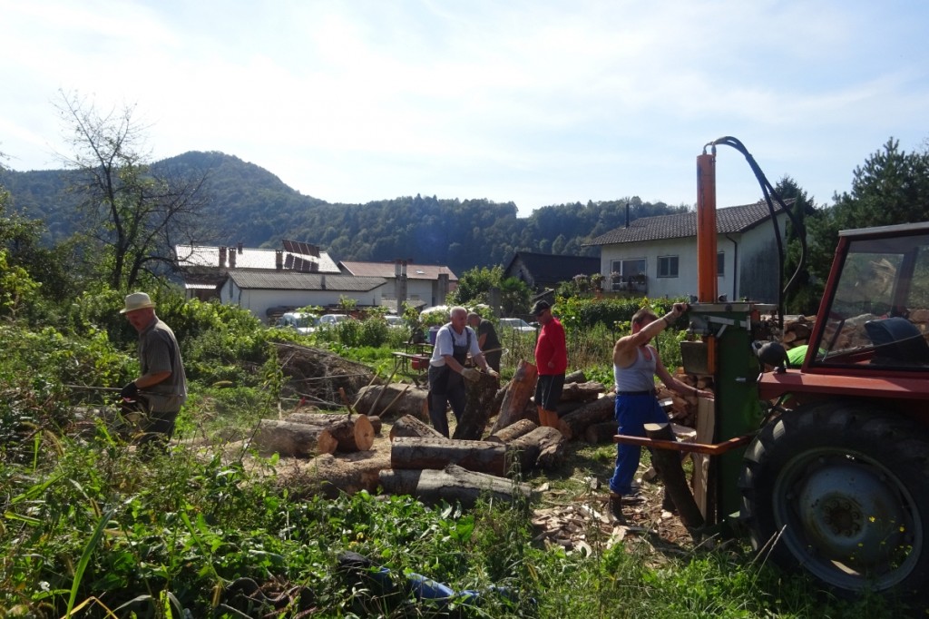 Najprej so očistili okolico in hlodovino, nakar so pričeli z razrezom in krojenjem. Nekaj kasneje smo se pridružili še Dušan, Ladislav, Senad in Stane. Do popoldan smo skrojili in zložili ves les. Nekaj pa smo ga razrezali za takojšnjo uporabo in prepeljali do hiše.